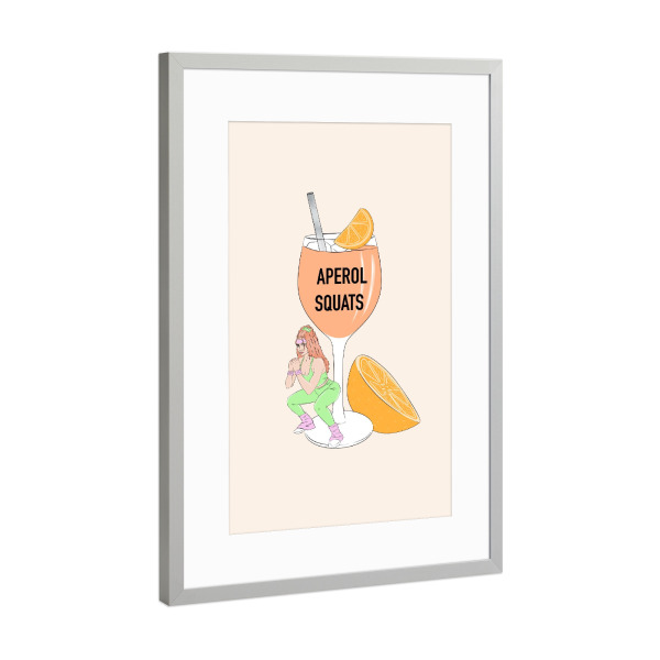 Poster mit Rahmen Silber "Aperol-Kniebeugen" artboxONE - Essen & Trinken,Essen & Trinken / Alkohol,Lustig - Aperol spritz,Fitnessstudio,Lustig