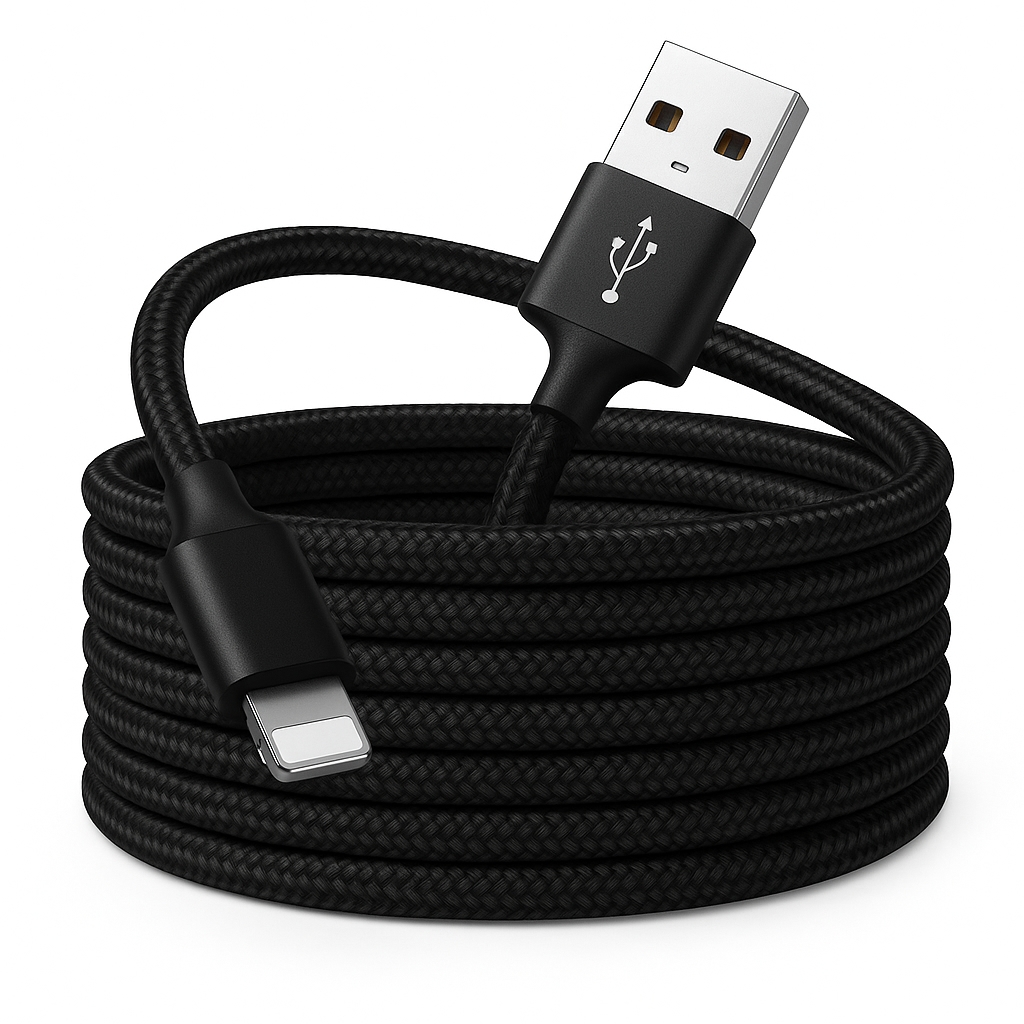 Nylon Schnellladekabel USB-A für Apple Geräte – 3 m Lade- und Datenkabel für iPhone 5 bis 14 inkl. Pro, Max, Mini, iPad und iPod – Schwarz