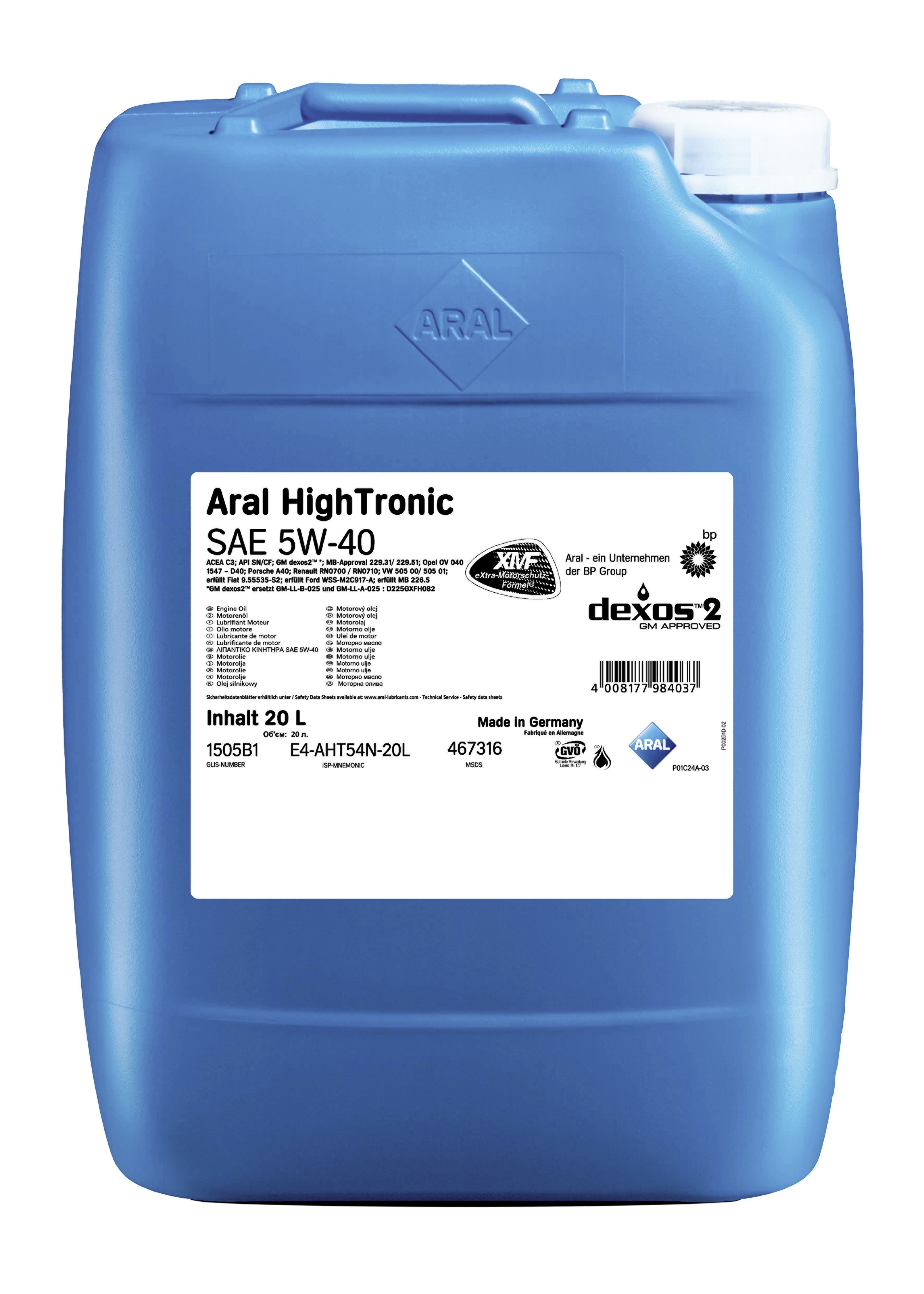 Aral HighTronic 5W-40 20 Liter Kanister SAE 5W-40 Motoröl, Leichtlauföl, High Performer, PKW, SAE 5W-40