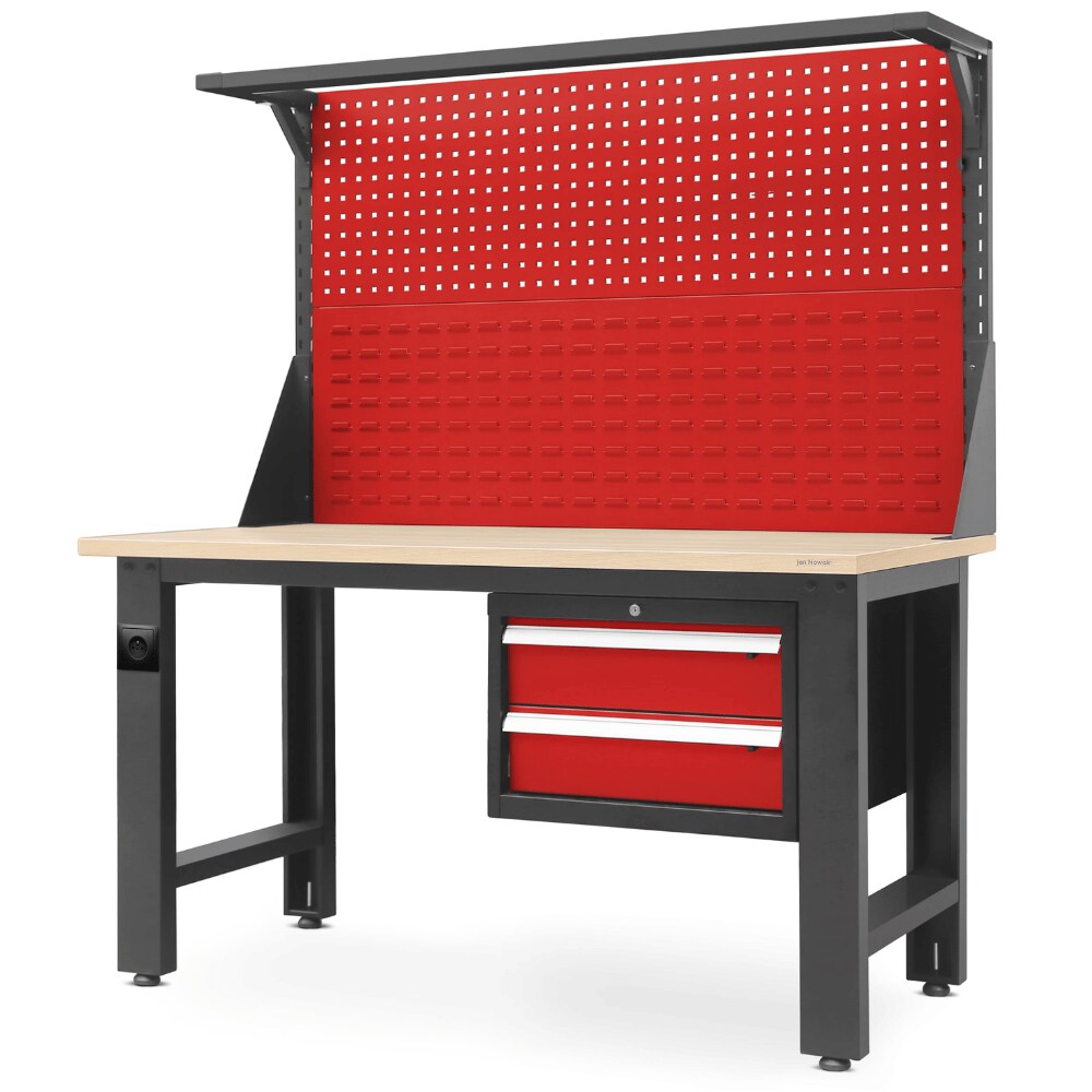 DELUKE Werkbank Werkstatt ROBI - Lochwand , 2 Schubladen | Werktisch Montagewerkbank Arbeitstisch Packtisch, 170x150x75cm Anthrazit-Rot, Platte Braun