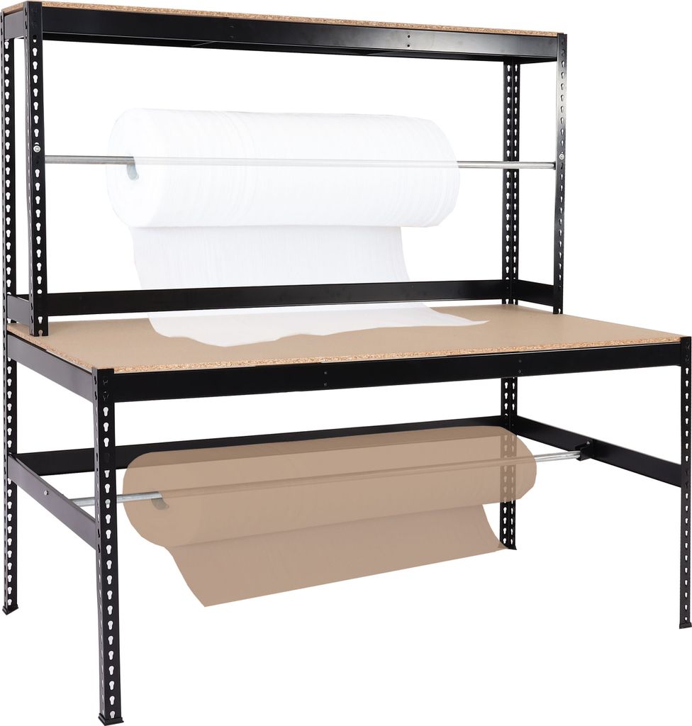 Mendler Packstation HWC-J84, Packtisch Arbeitstisch Werktisch, Rollenhalter höhenverstellbar, Holz Stahl 183x183x90cm, schwarz