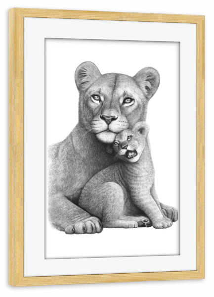 Poster mit Rahmen kiefer "Lioness with a baby" artboxONE - Tiere,Schwarzweiß,Liebe,Für Mama - Lion,Lioness,Mother,Love,Löwe