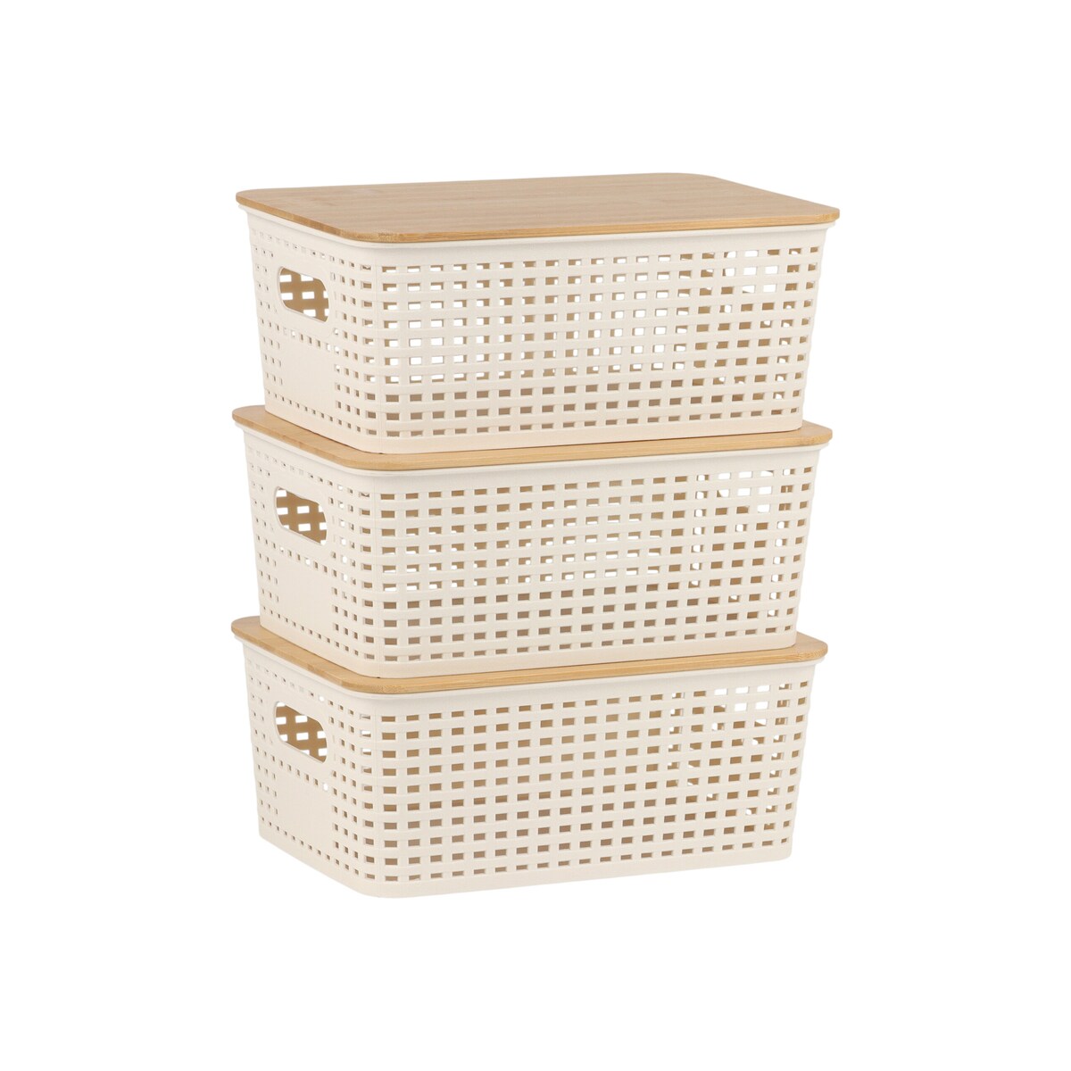 Relaxdays Aufbewahrungsbox, 3er Set, mit Deckel, Kunststoff & Bambus, mit Griffen, HBT: 10,5x25,5x18 cm, Organizer, weiß