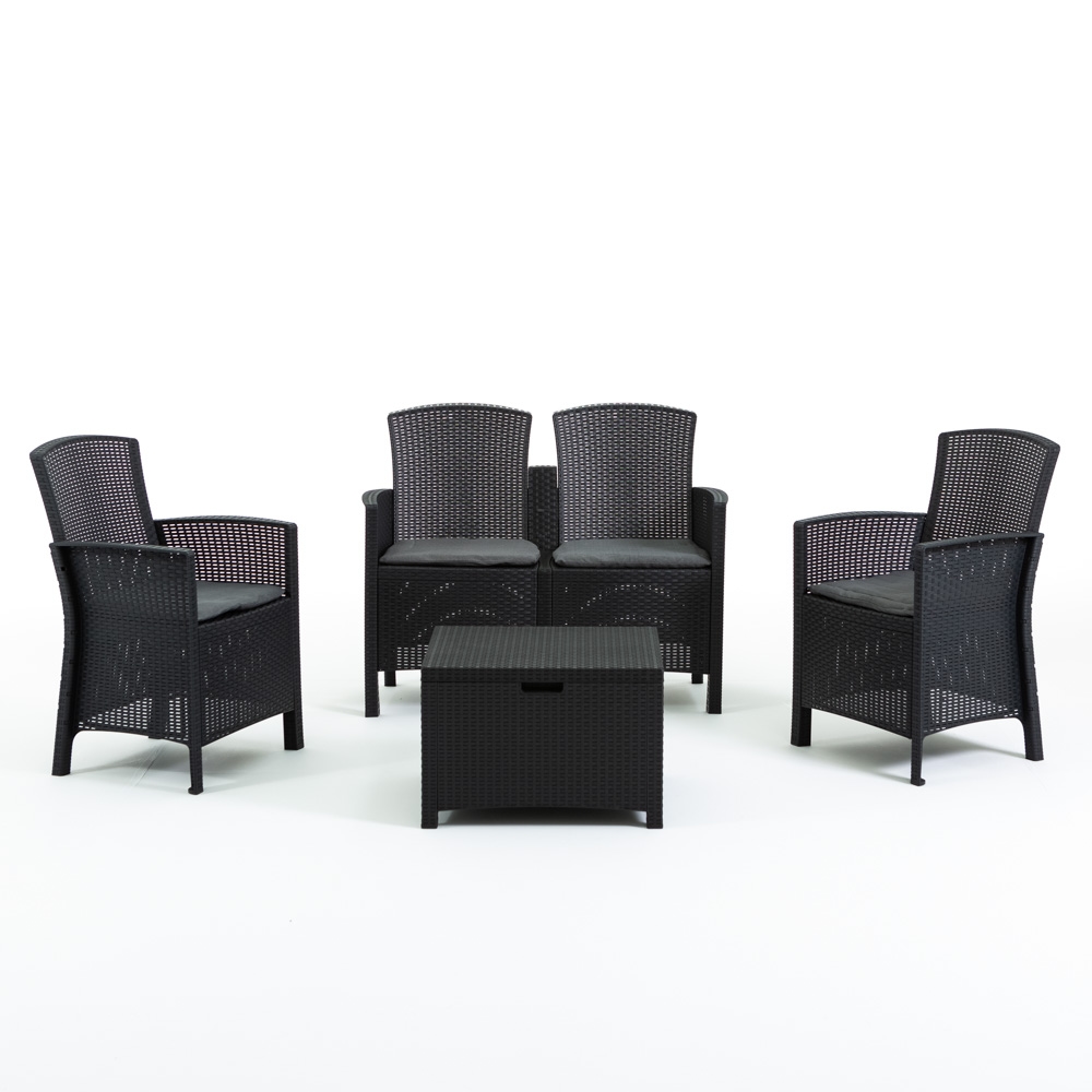 Outdoor-Lounge-Set Dbalestrer, Gartenkomposition mit 2 Sesseln, 1 Sofa und 1 Aufbewahrungstisch, Rattan-Effekt mit Kissen, 100 % Italy, Anthrazit
