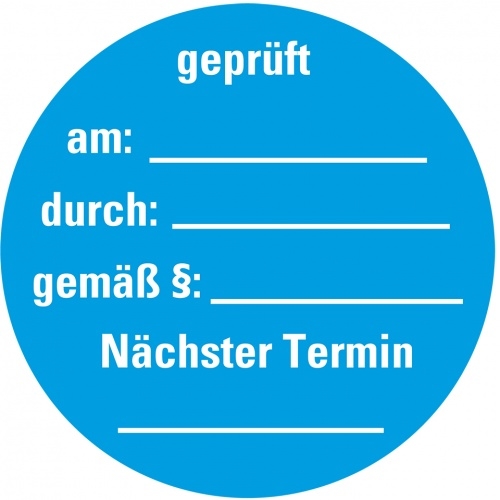 König Werbeanlagen Dreifke Aufkleber I Prüfplakette Geprüft am durch gemäß § Nächster Prüftermin, hellblau, Dokumentenfolie, Ø 30mm, 18/Bogen