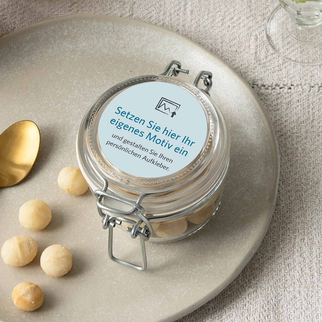 Aufkleber selbst gestalten. Grosser runder Aufkleber in weiss. Personalisierte Aufkleber Gestaltungsfreiheit als Hochzeitsdeko gestalten..