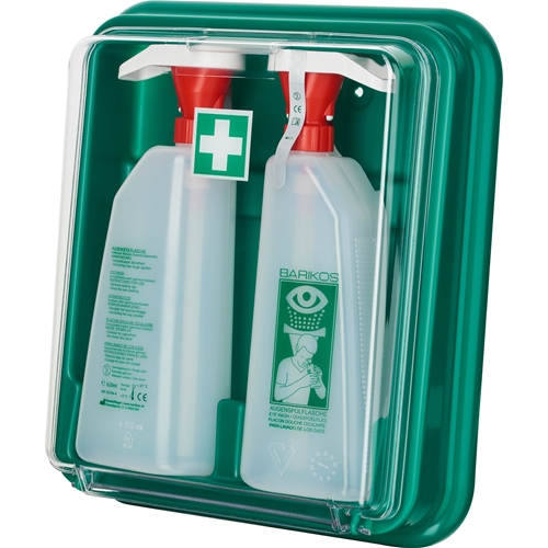 Augenspülstation DUO mit einer Augenspülflasche DUO, 1000 ml Natriumchloridlösung (0,9%)