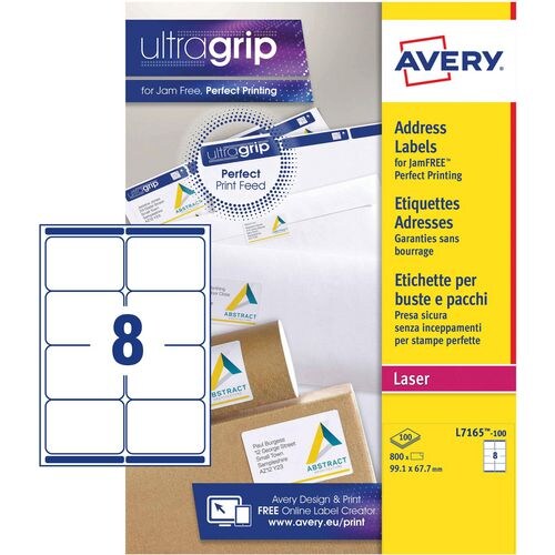 Avery Zweckform L7165-100 Versand-Etiketten, A4 mit ultragrip, 99,1 x 67,7 mm, 100 Bogen/800 Etiketten, weiß