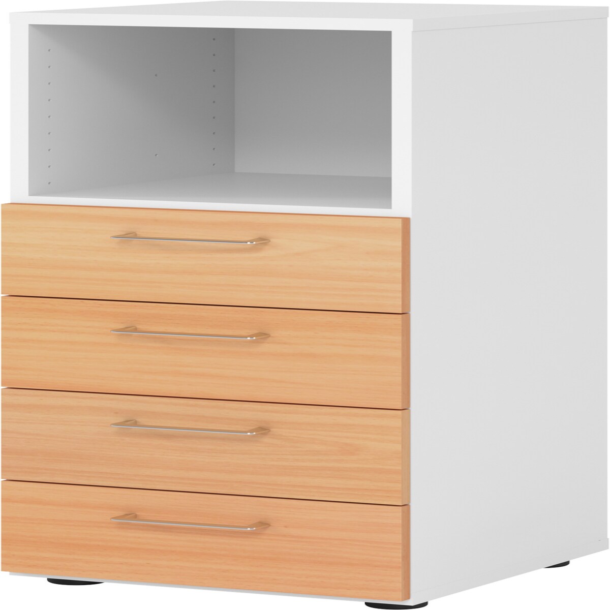 bümö smart Schubladenschrank, Büroschrank in Weiß/Buche mit 4 Schüben & 1 Regalfach - Bürocontainer aus Holz, Container mit Metallgriffen & Soft-Stop