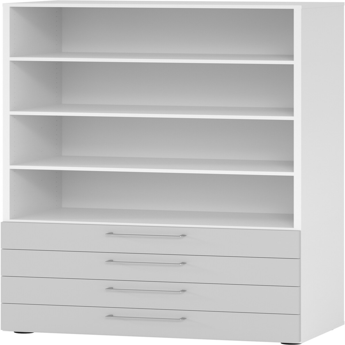 bümö smart Schubladenschrank, Büroschrank 80cm breit in Weiß/Grau mit 4 Schüben & 4 Regalfächern - Bürocontainer aus Holz, Container mit