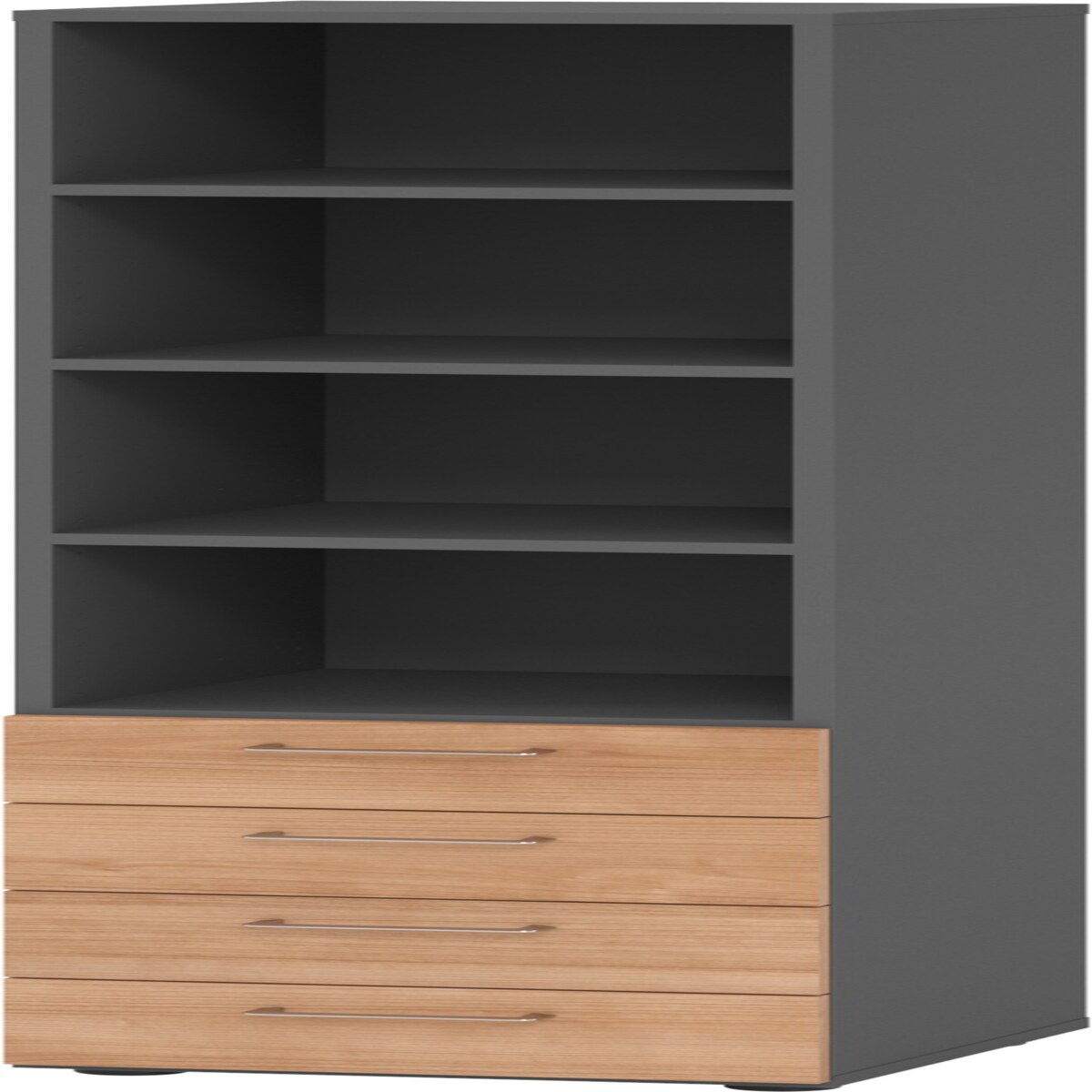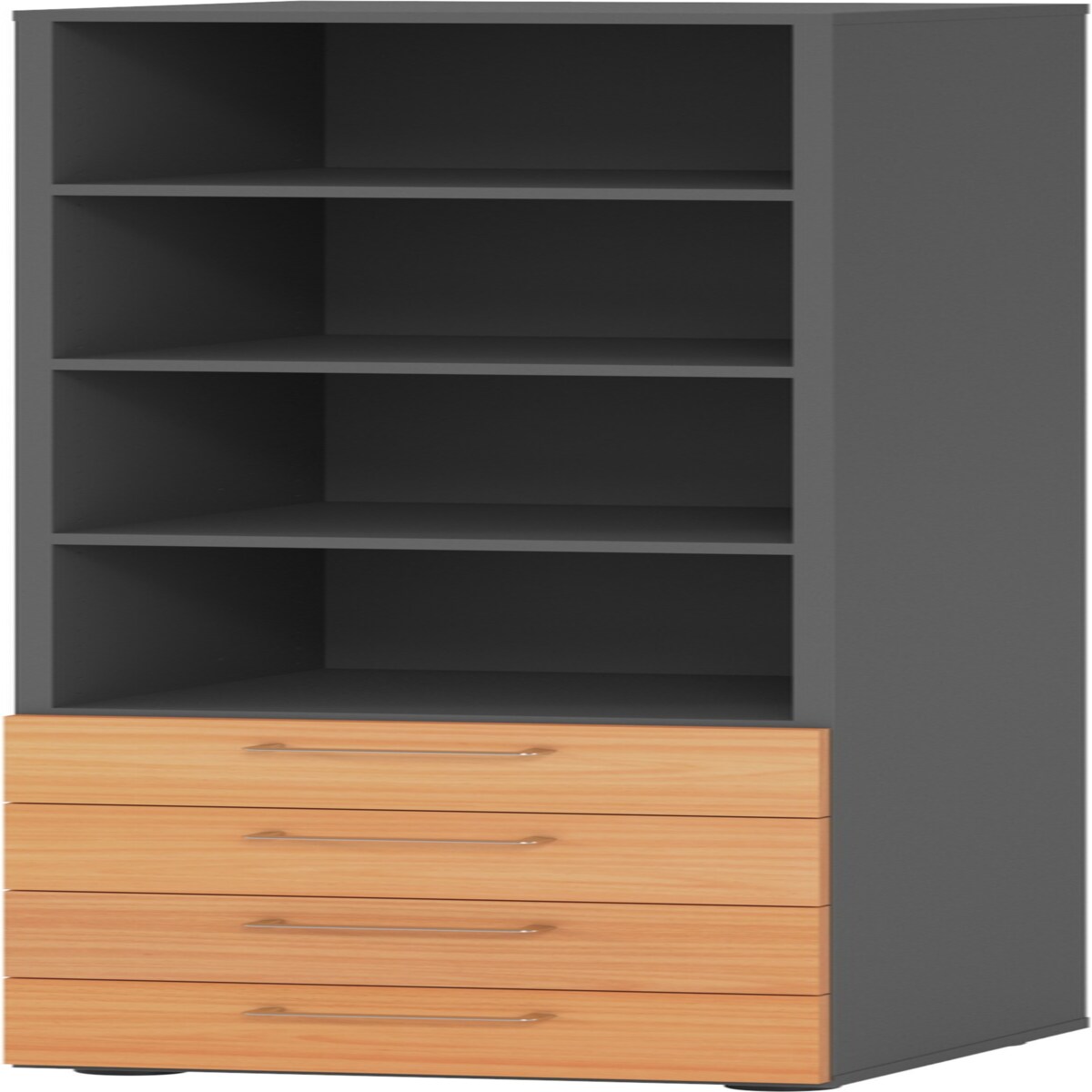 bümö smart Schubladenschrank, Büroschrank in Graphit/Buche mit 4 Schüben & 4 Regalfächern - Bürocontainer aus Holz, Container mit Metallgriffen &