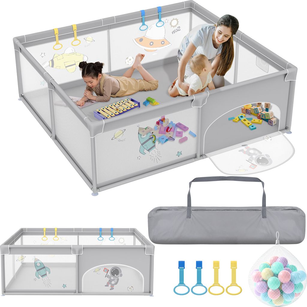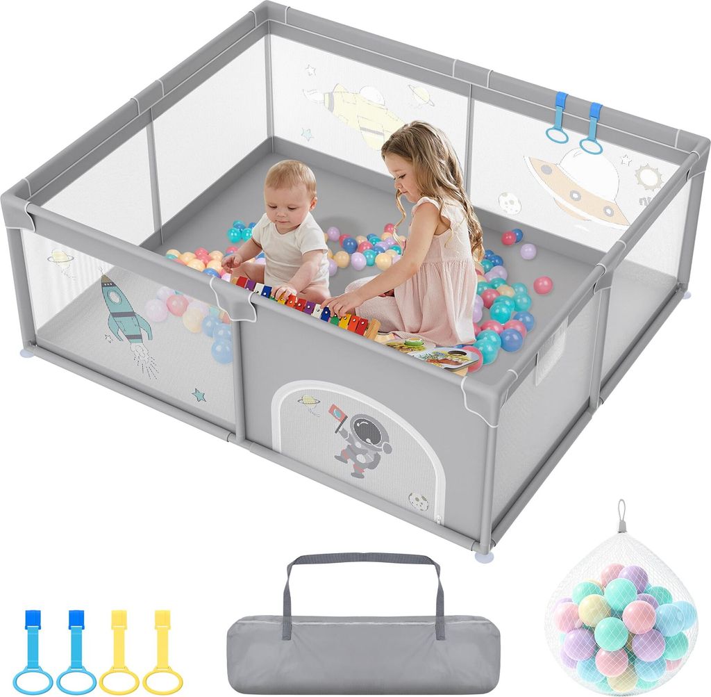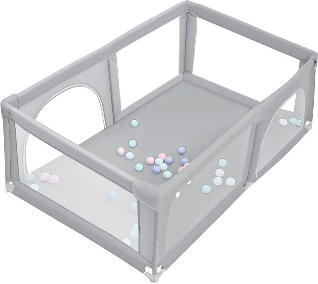 Laufstall Baby Laufgitter 180x120cm Rutschfester Absperrgitter mit Atmungsaktive Netz Schutzgitter Kind Playpen Set mit Bällen hellgrau