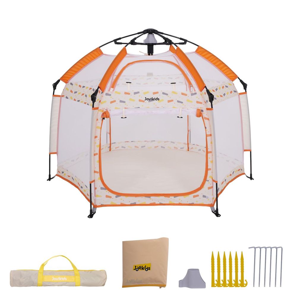 Jovikids Faltbarer Laufstall Baby mit Baldachin, Pop-up Zelt Kinder Outdoor, Großer 6 Eckig Playpen mit Tragetasche für Haus, Garten, 150x150x105cm