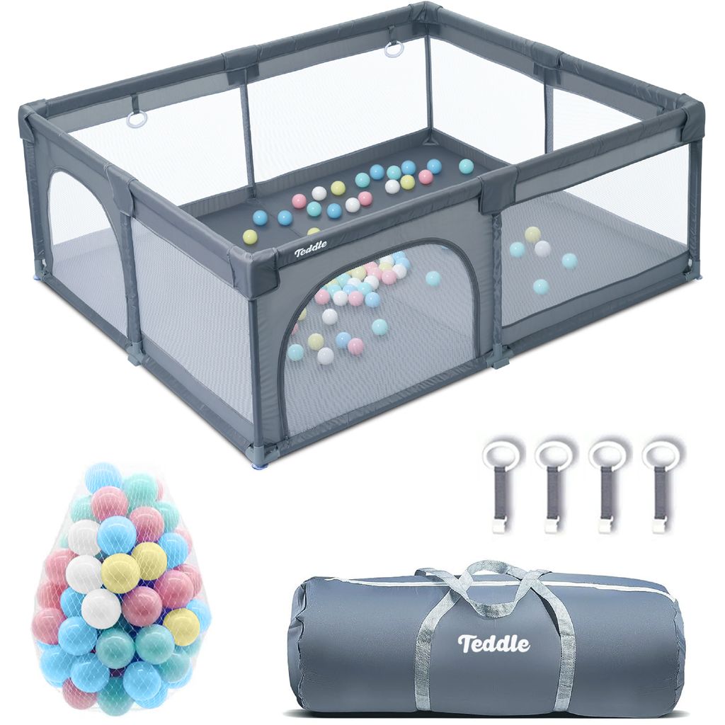 Teddle Laufstall Baby - Laufgitter Baby mit 50x Spielbälle - 180 x 150 cm – Playpen für Innen und Draußen – Grau