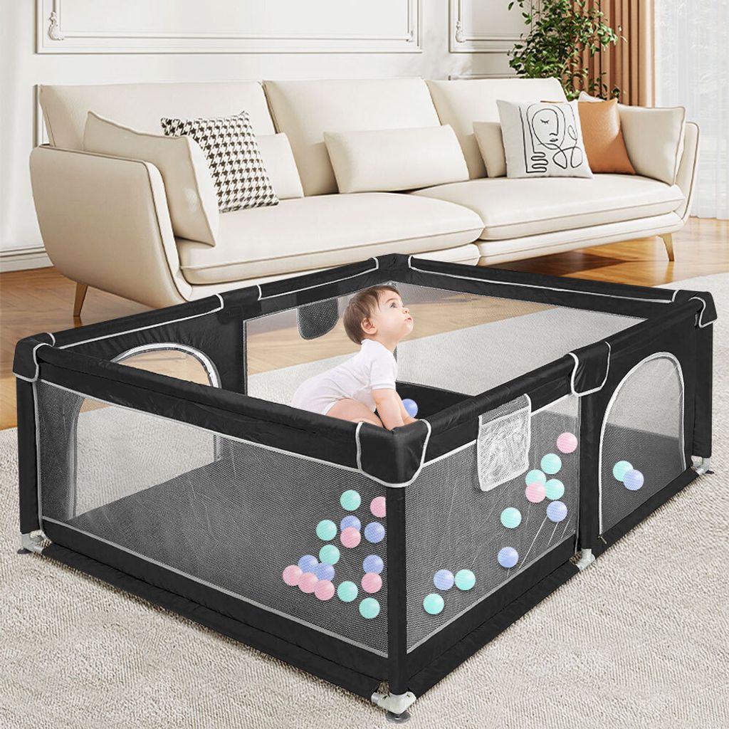 Laufstall Baby Laufgitter 180x120cm Rutschfester Absperrgitter mit Atmungsaktive Netz Schutzgitter Kind Playpen Set mit Bällen Schwarz