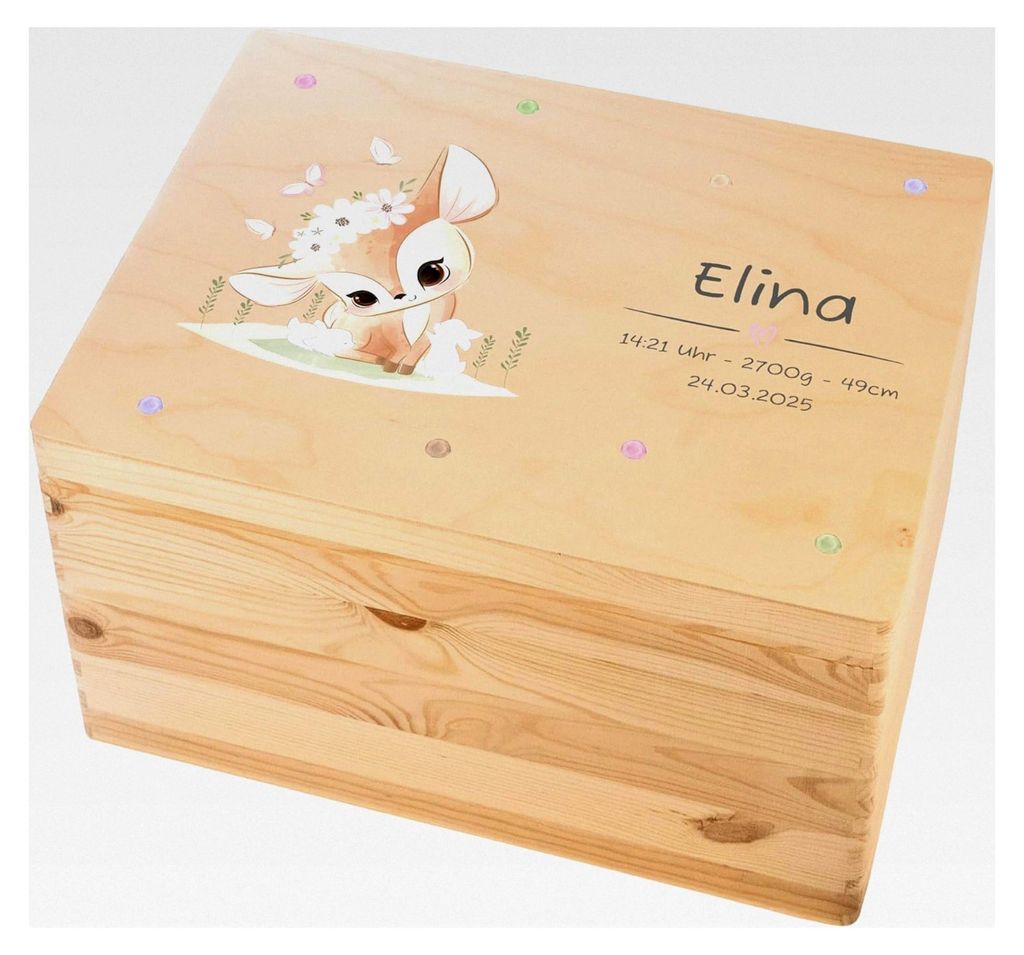 LARIFEE personalisierte Erinnerungsbox Reh – Holzkiste für Baby Andenken groß 40x30x23 cm – Geschenk zur Geburt, Taufe & Babygeschenk