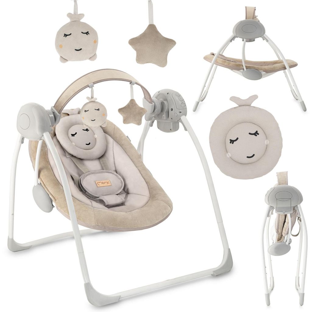 MoMi LISS – Elektrische Babywippe klappbar mit Timer, 5 Geschwindigkeiten, 6 Melodien & verstellbarem Spielbogen - Beige