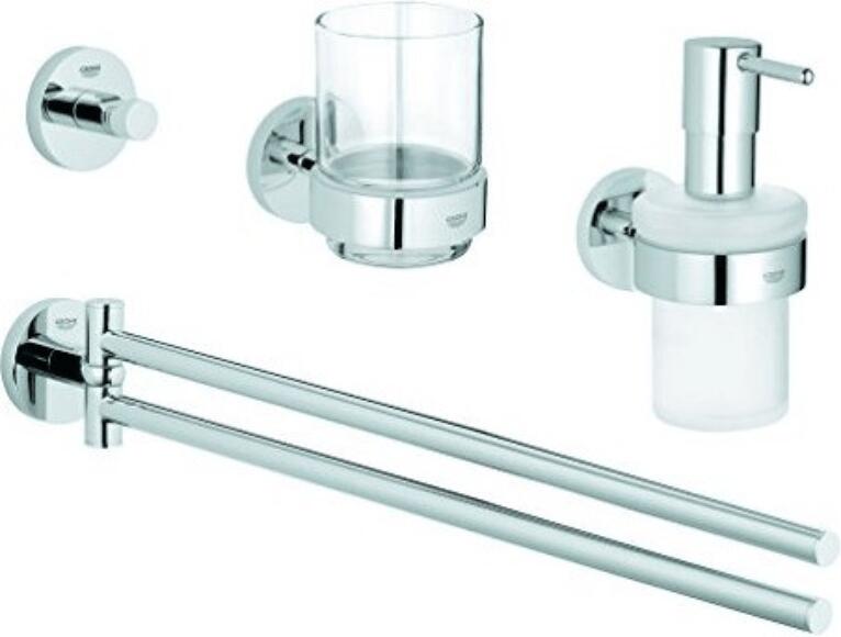 GROHE Essentials Bad-Set 4in1 Zubehör, Seifenspender, Handtuchstange, Zahnputzbecher, Bademantelhaken (40846001)