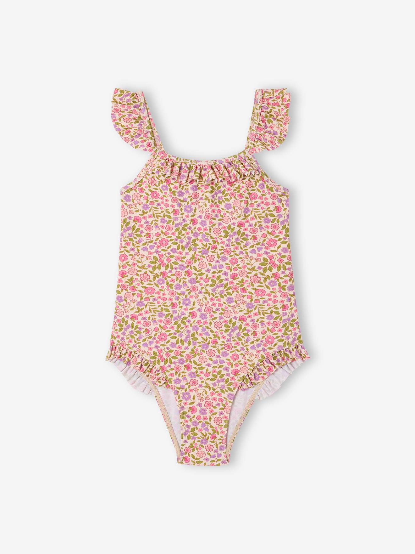 Mädchen Badeanzug mit Rüschen & Blumenmotiven rosa Gr. 92/98 von vertbaudet