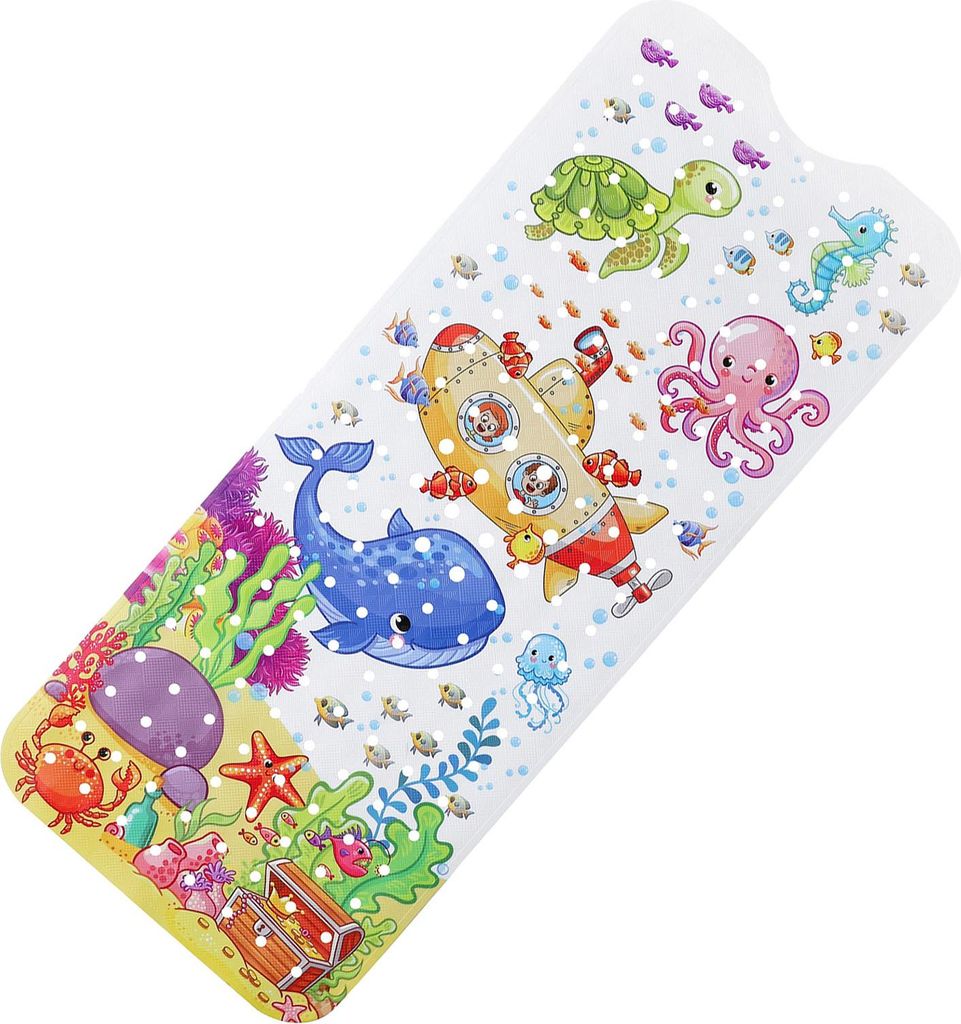 100 x 40 cm Cartoon-Badewannenmatte mit Meerestieren und Abflusslöchern mit Saugnapf, rechteckige rutschfeste PVC-Matte fürs Badezimmer, maschine...