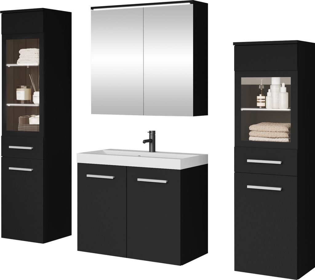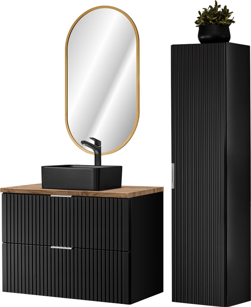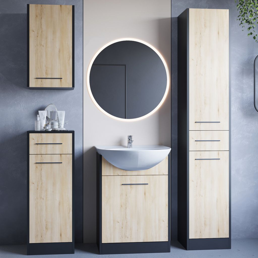 Badezimmer komplett Set, mit ovalem LED Spiegel, Keramik Waschbecken und Hochschrank, schwarz matt mit Eiche Nb., Front gerillt, ADELAIDE-56-BLACK,...