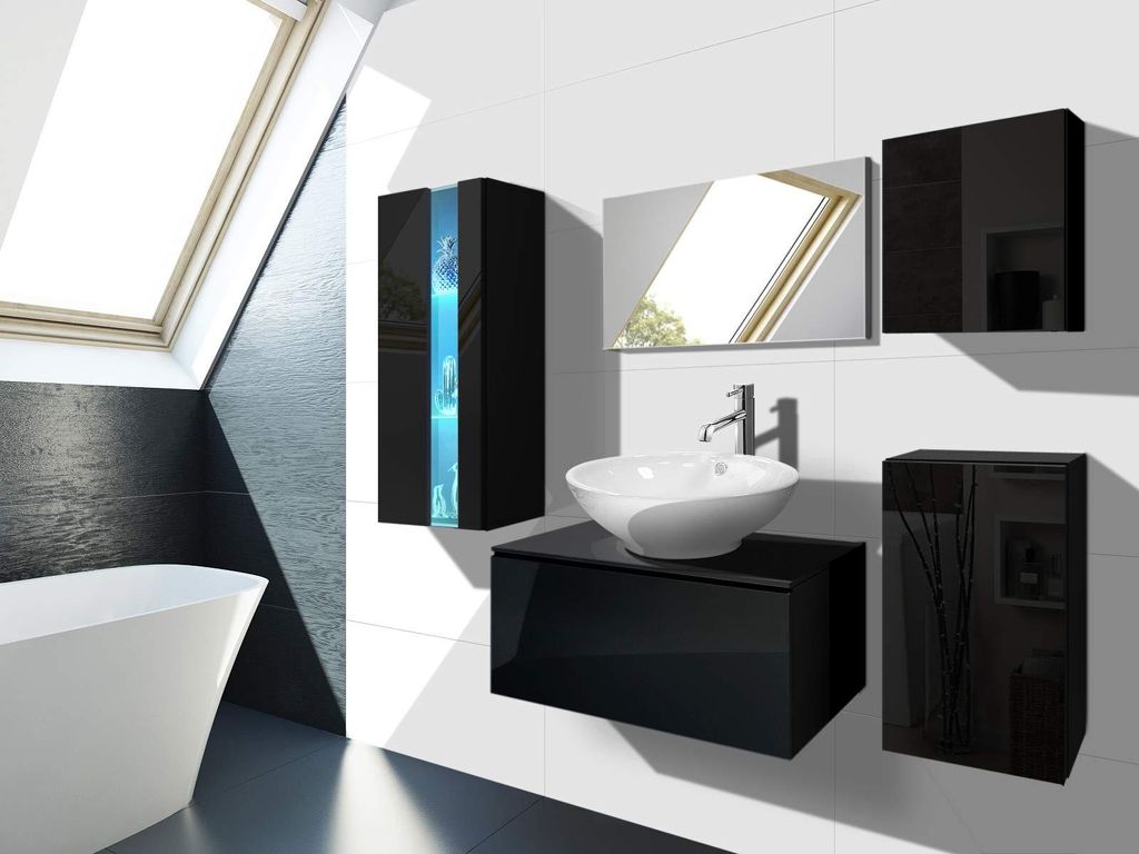 MIRJAN24 Badmöbel-Set Madrit II, Badezimmer-Set mit Spiegel und Waschbecken (Farbe: Schwarzer Graphit, mit Siphon, mit weißer LED Beleuchtung)