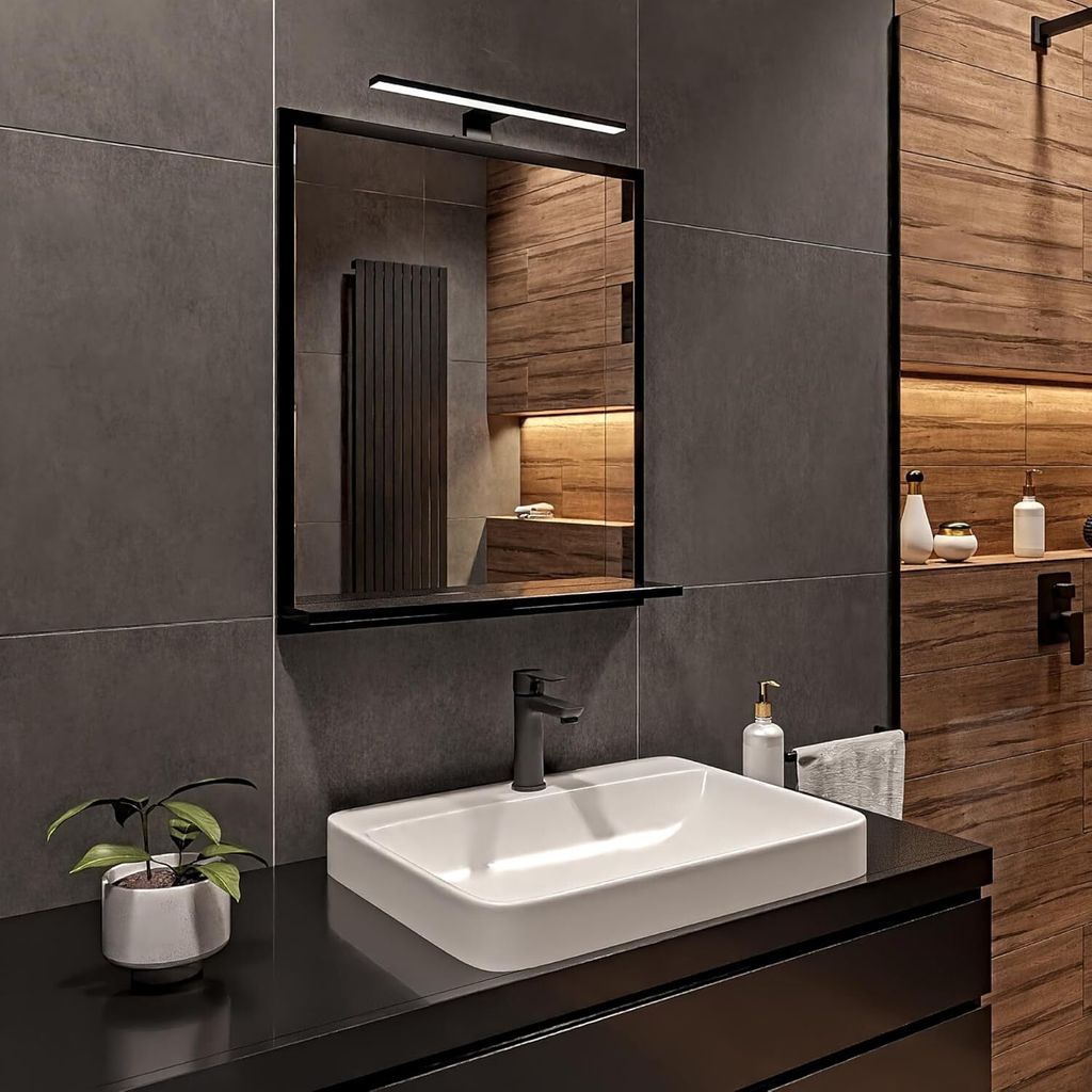 Schwarz Badspiegel mit Beleuchtung 4000 K IP44 H:70 x B: 60 cm - Bathroom Mirror - Badezimmer Spiegel Rechteckig mit Ablage und Schwarze LED-Lampe