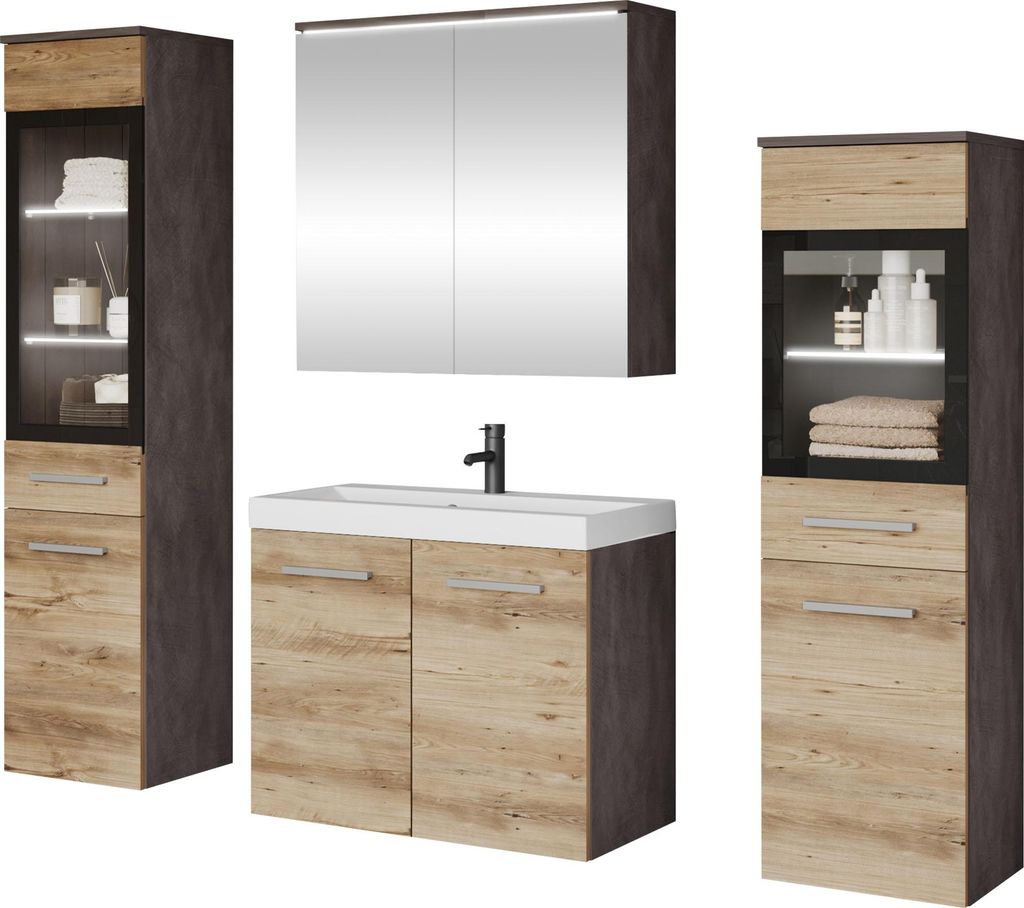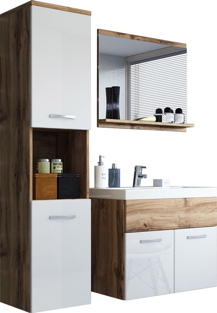 MIRJAN24 Badmöbel-Set Montreal, Badezimmer-Set mit Spiegel und Waschbecken (Farbe: Wotan / Weiß Hochglanz, mit Siphon)