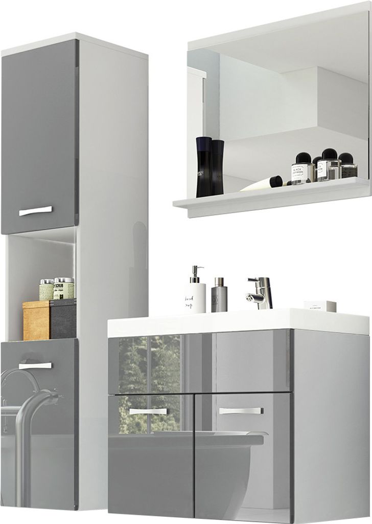 MIRJAN24 Badmöbel-Set Montreal, Badezimmer-Set mit Spiegel und Waschbecken (Farbe: Weiß / Grau Hochglanz, mit Siphon)