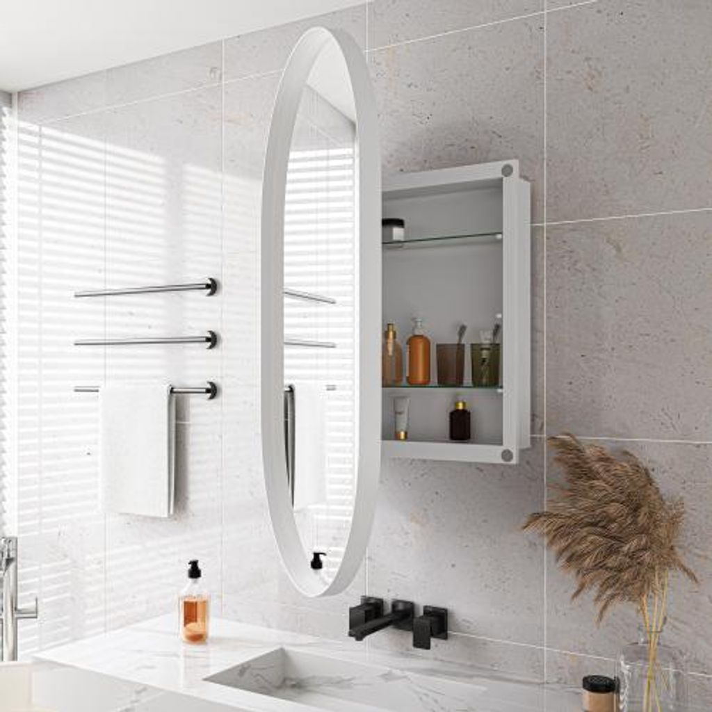 Zimilo Ovaler Spiegelschrank, Medizinschrank, Metallrahmen, Wand- & Einbau, Badschrank mit Spiegel, verstellbare Regale, Stauraum Badezimmer, Weiß