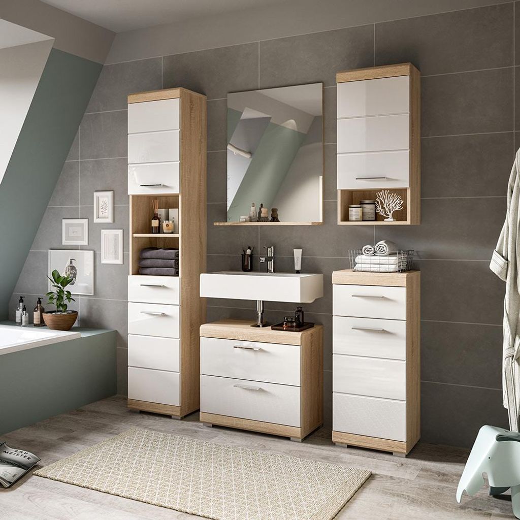 Badezimmer-Set 5-teilig in Sonoma Eiche mit weiß Hochglanz, mit Spiegel - SIROCO-158