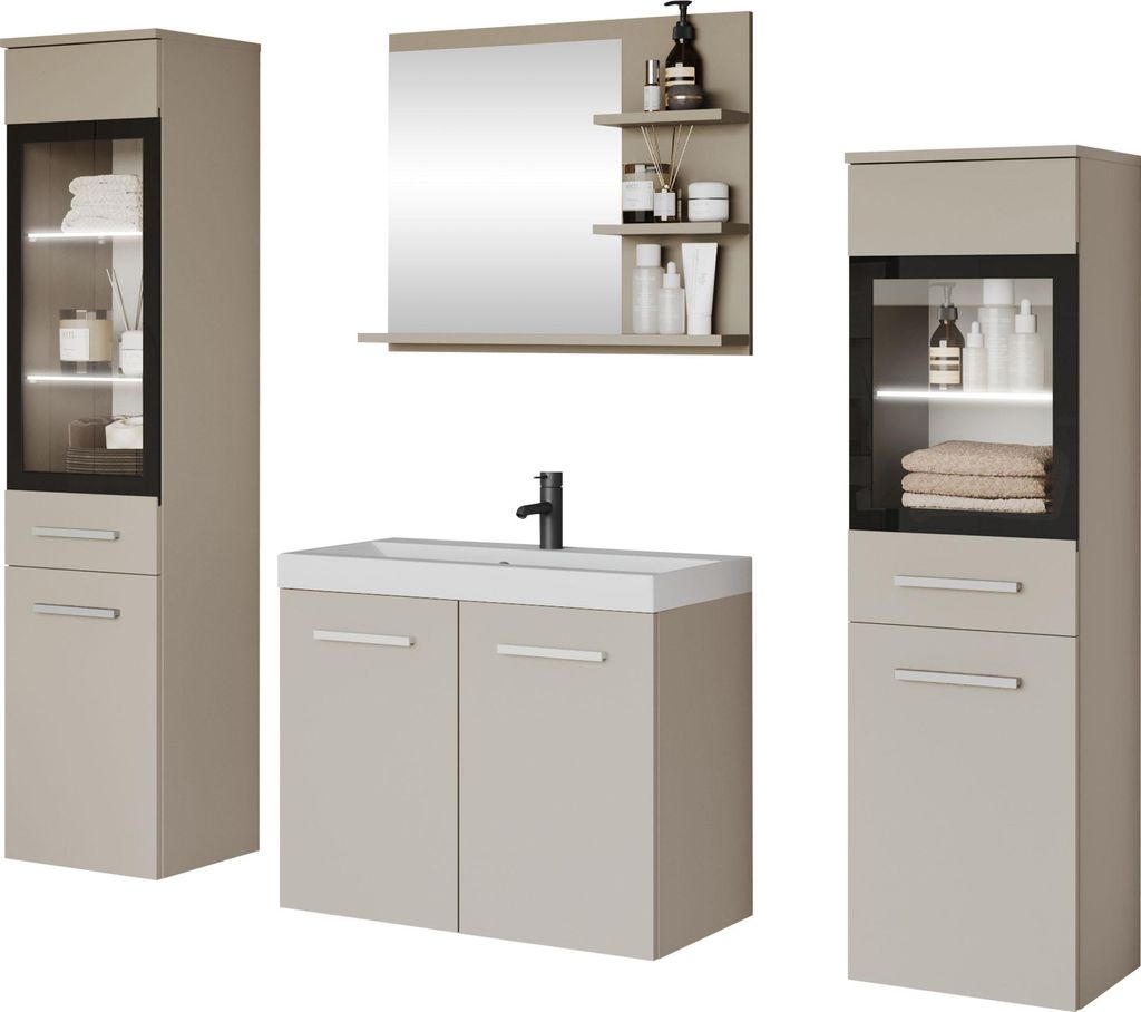 MIRJAN24 Badmöbel-Set Madrit I, Badezimmer-Set mit Spiegel und Waschbecken (Farbe: Cashmerebeige, mit Siphon, mit weißer LED Beleuchtung)