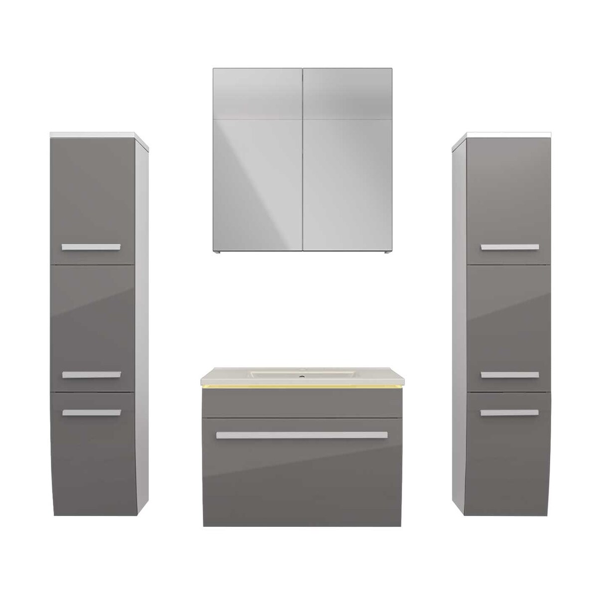 Badezimmermöbel Komplett Set mit Spiegel, LED Beleuchtung, 2 seitl. Handtuchhalter, Griffleisten schwarz, Hochglanz grau, PALERMO-136-GREY, B/H/T...