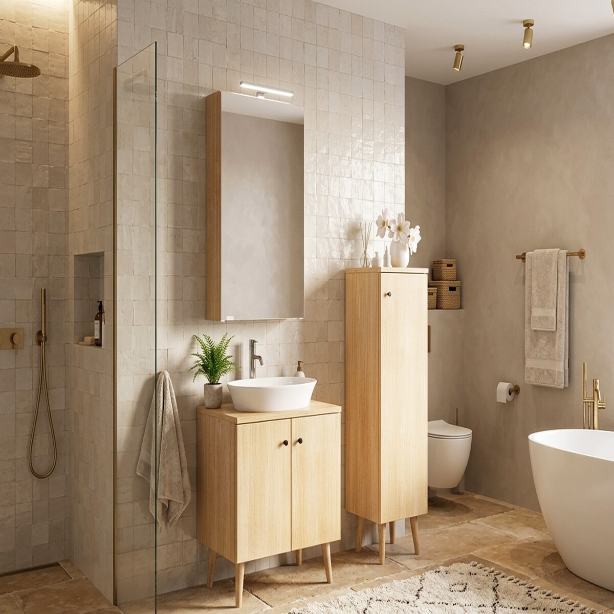MONCLERO GF1 |Badezimmermöbel Set TAMO 2 Kaschmir Matt Gold – Waschtisch 60 cm + 2x Hängeschrank 80 cm 3-teilig