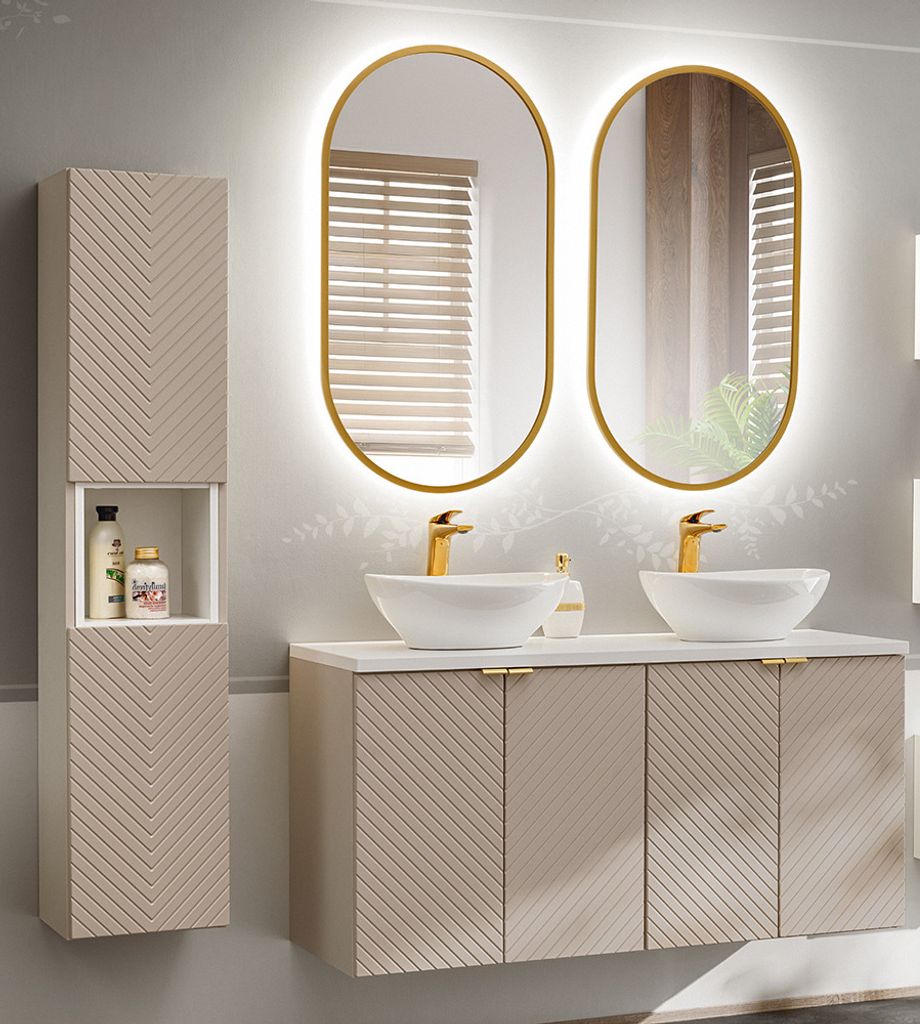 Badmöbel-Set 4-teilig mit 120 cm Waschtisch, Hochschrank & 2 Spiegeln in beige mit Eiche - MURANO-140