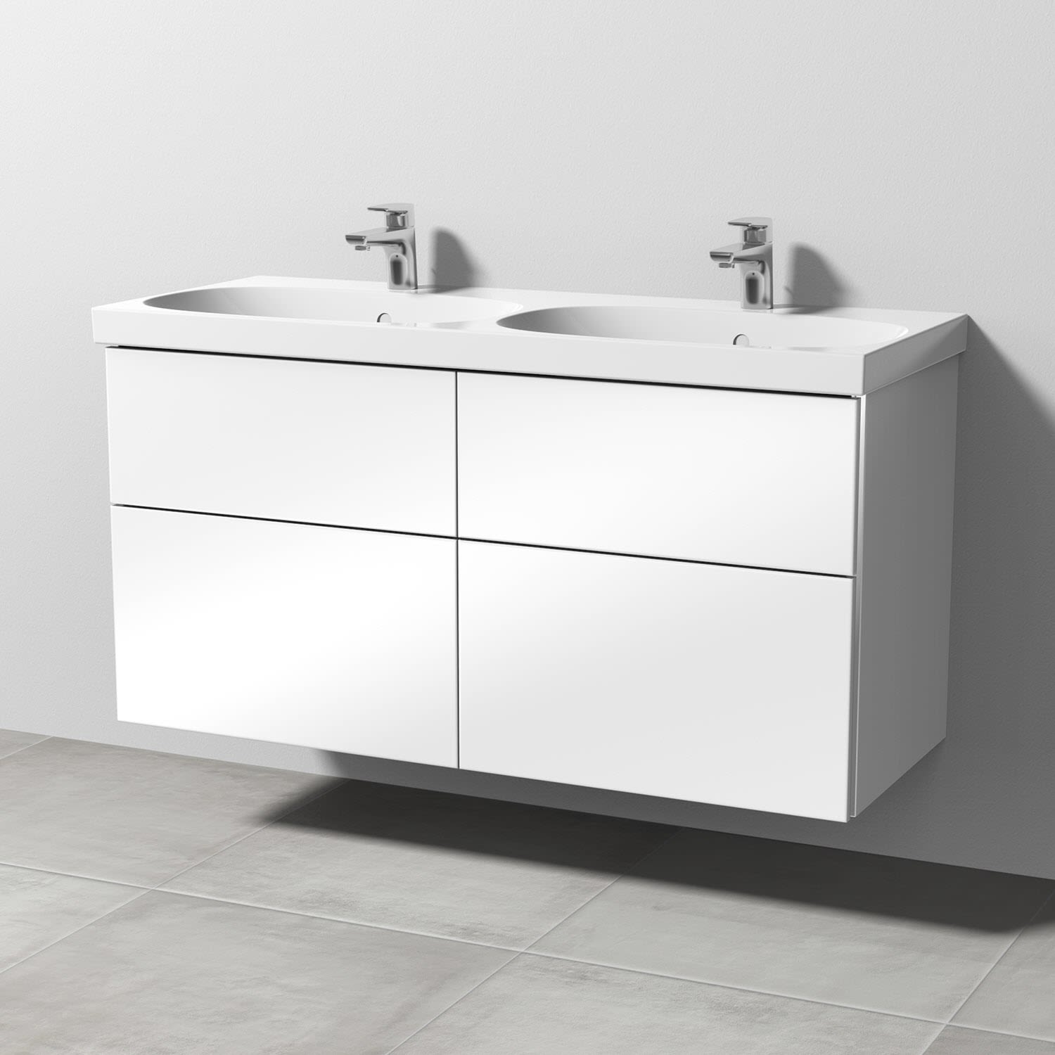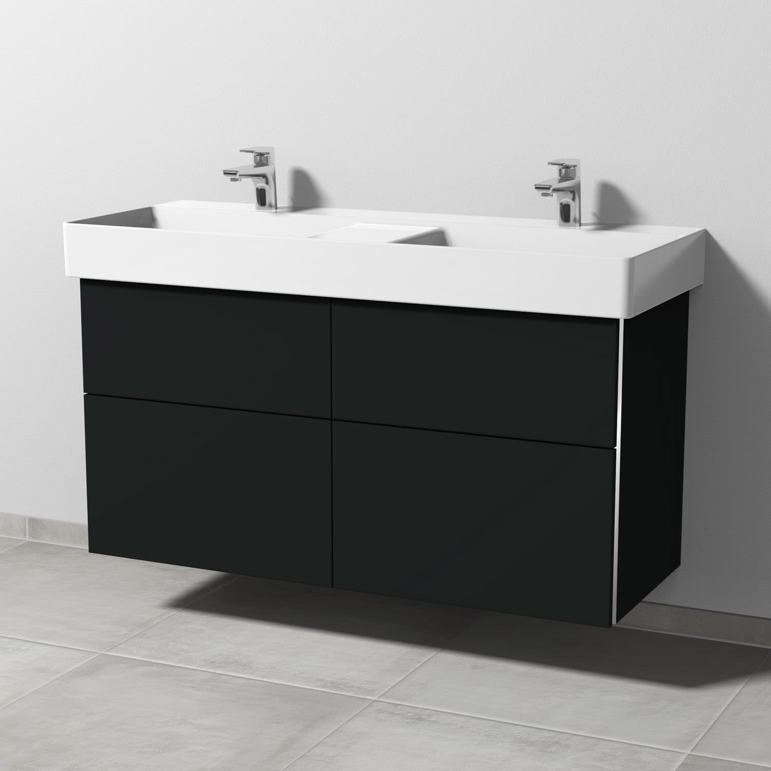 Sanipa 3way Unterschrank 120 cm, 4 Auszüge, Aufsatz-Griffe mit Villeroy & Boch Finion Doppelwaschtisch, Badmöbel,