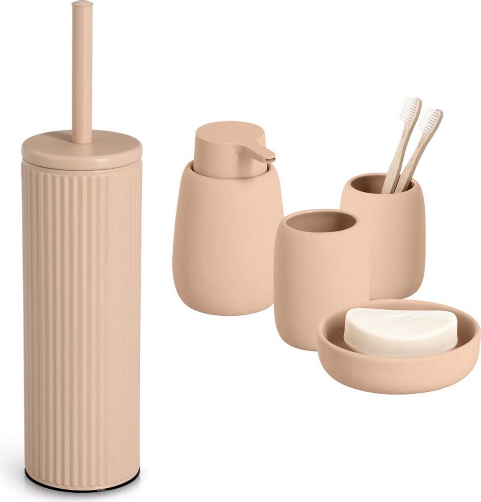 5-teiliges Badezimmer-Set Keramik mocca, Badzubehör-Set besteht aus: Seifenspender, 2x Zahnputzbecher, Seifenschale, WC-Bürste, moderne Badaussta...