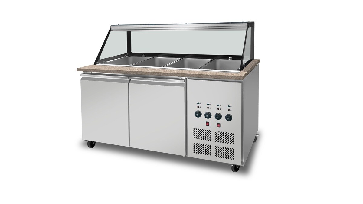 Skyrainbow SNACK-Line Bain-Marie Theke 3x GN1/1, Granit rosa-grau, 123x82x85,5 Glasaufbau Klarglas mit Zwischenablage, H=496mm