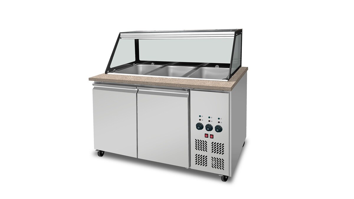 Skyrainbow SNACK-Line Bain-Marie Theke 3x GN1/1, Granit rosa-grau, 123x82x85,5 Glasaufbau Klarglas schwarzer Rand, ohne Zwischenablage, H=396mm