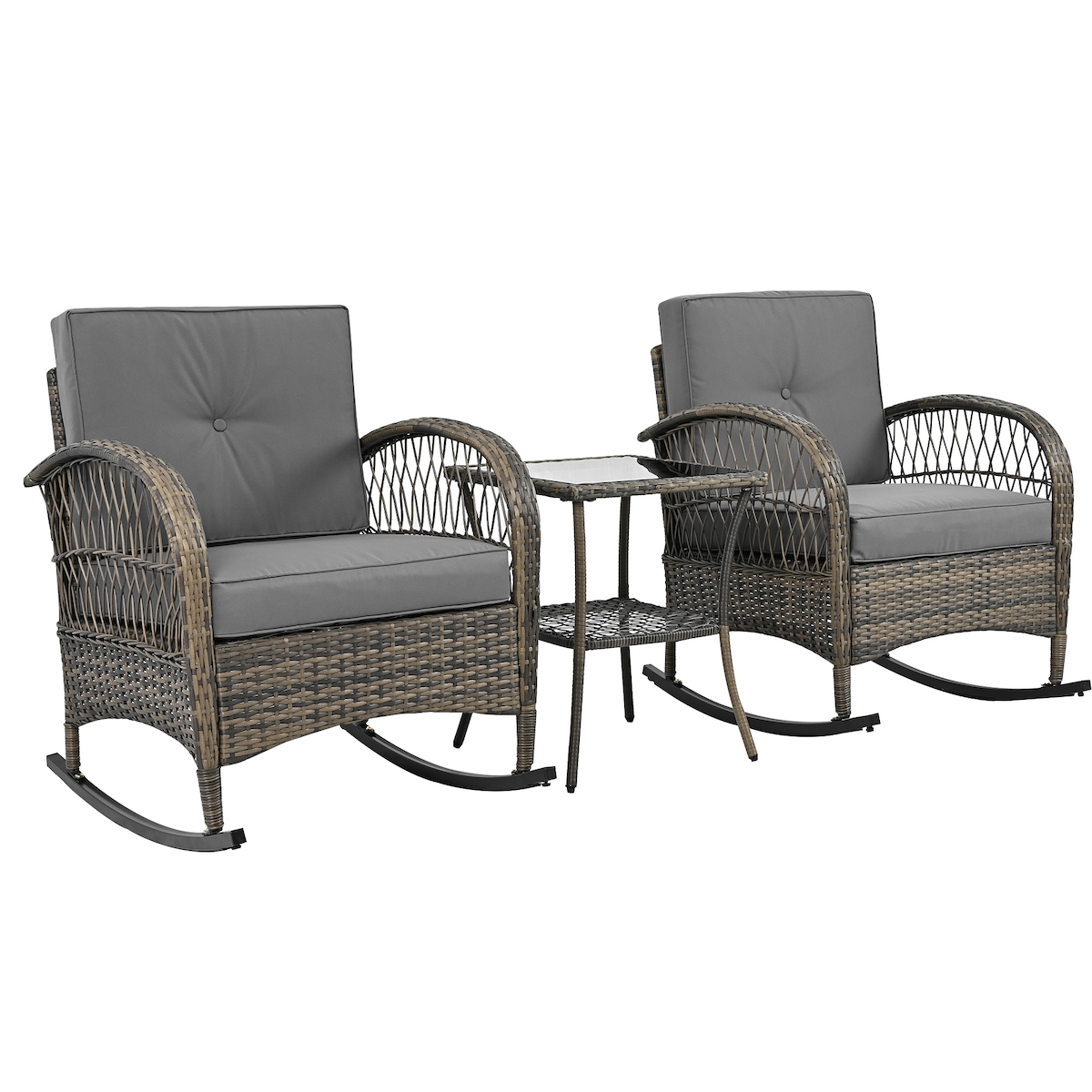 OKWISH Rattan Schaukelstuhl Set 2er mit Glastisch Garten Lounge Outdoor Sessel wetterfest mit Kissen Balkon Terrassenmöbel Schwarz Grau
