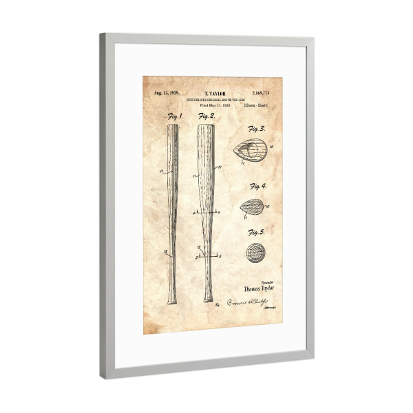 Poster mit Rahmen Silber "Baseballschläger Patent (Antik)" artboxONE - Sport - Sport,Baseball,Vintage,Patent,Usa,Fitness