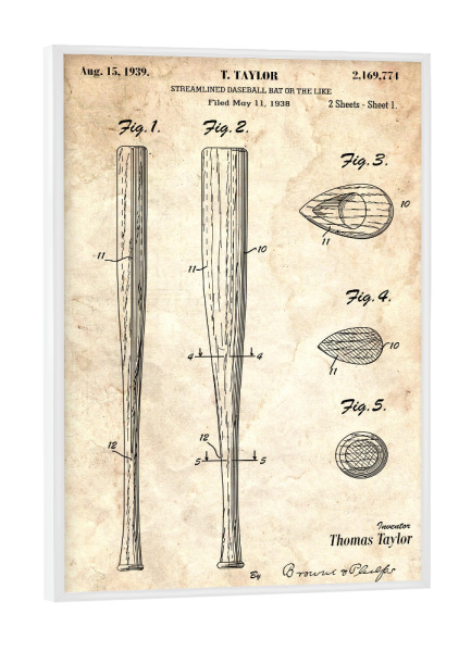 Poster mit weißem Rahmen "Baseballschläger Patent (Antik)" artboxONE - Sport - Sport,Baseball,Vintage,Patent,Usa,Fitness