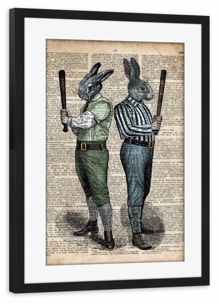 Poster mit Rahmen schwarz "Baseball-Kaninchen" artboxONE - Tiere - Tier,Wörterbuch,Vintage,Geweih,Hase,Wald,Viktorianisch,Kaninchen,Baseballschläger