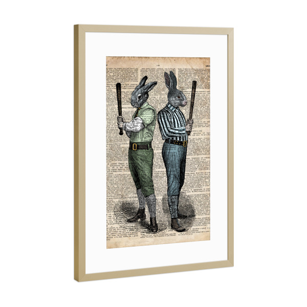 Poster mit Rahmen Gold "Baseball-Kaninchen" artboxONE - Tiere - Tier,Wörterbuch,Vintage,Geweih,Hase,Wald,Viktorianisch,Kaninchen,Baseballschläger
