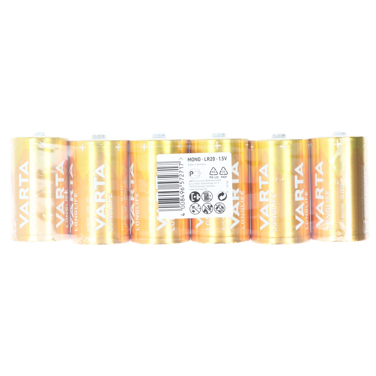Varta Batterie Alkaline, Mono, D, LR20, 1.5V Longlife, Folienverpackung (6-Pack)