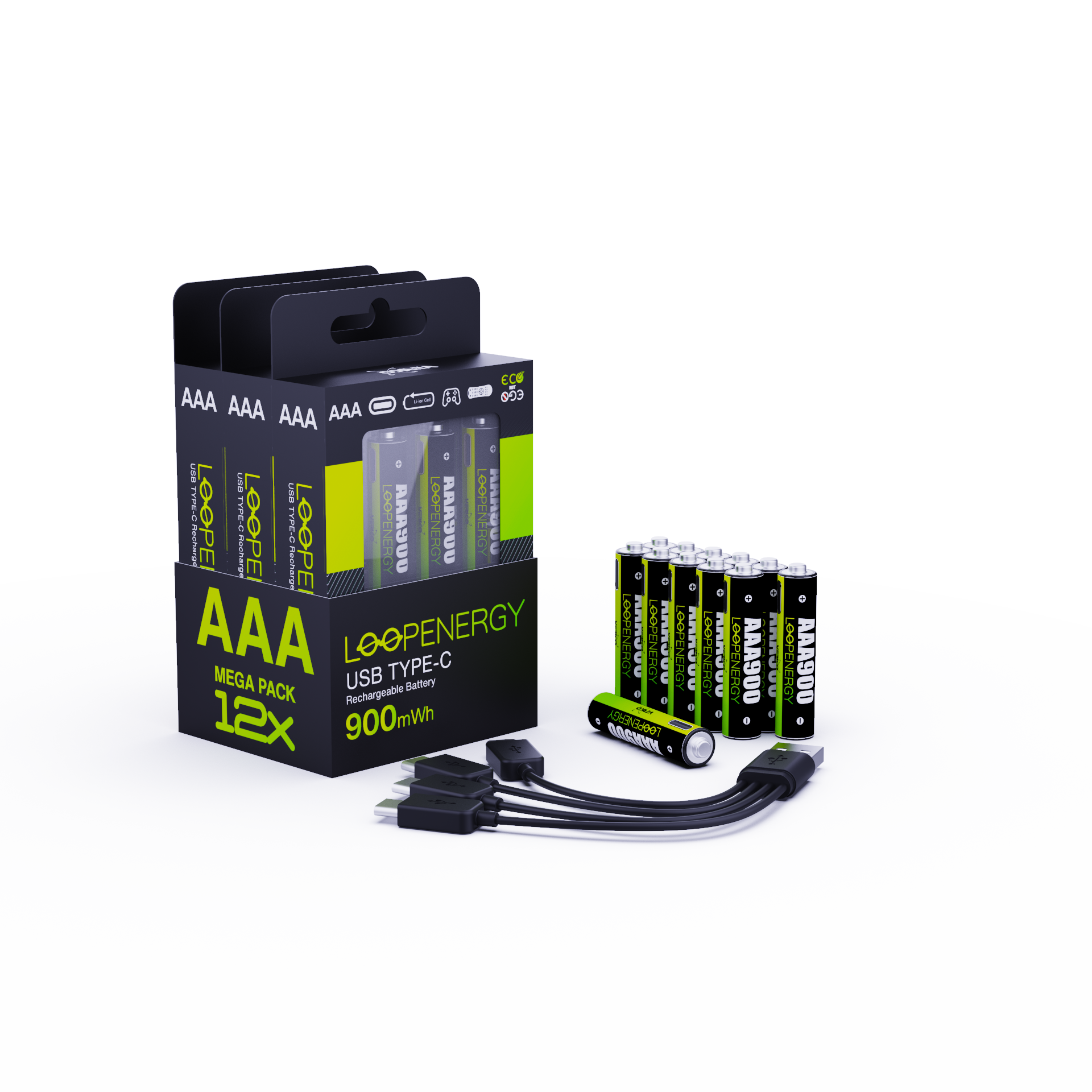VERICO LoopEnergy 12-Pack AAA - Wiederaufladbare USB-C Batterie AAA 1,5V 900mWh 600mAh Li-Ion, USB-C, 12er Pack AAA, 3 Stück Kabel USB-A auf 4 x USB