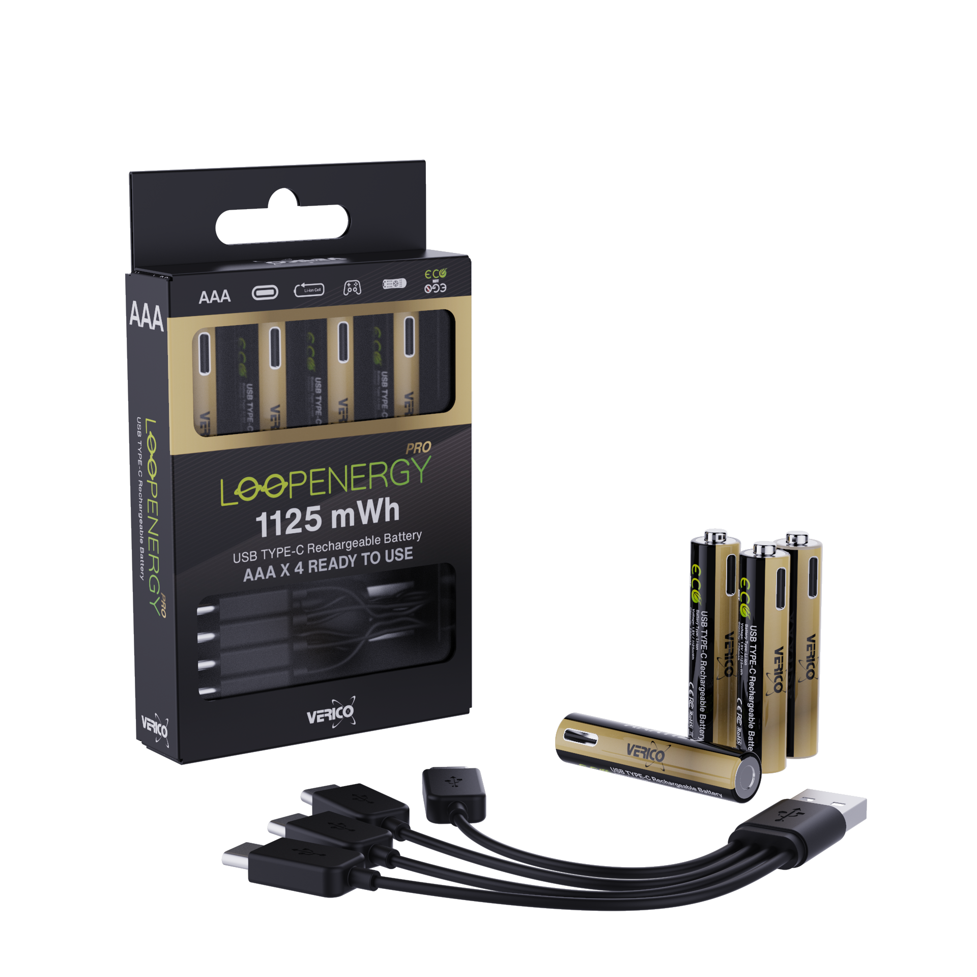 VERICO LoopEnergy 4-Pack AAA PRO - Wiederaufladbare USB-C Batterie AA 1,5V 1125mWh 750mAh Li-Ion, USB-C, 4er Pack AA, 1 Kabel USB -A auf 4 x USB-C