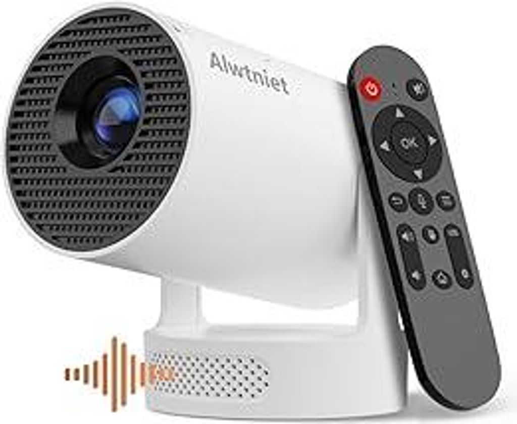 Alwtniet Mini Projektor, Mini Beamer 4K Unterstützt, Wi-Fi 6 und Bluetooth 5.4, 5W Lautsprecher, Automatischer Trapezkorrektur, 180° drehbar, tra...