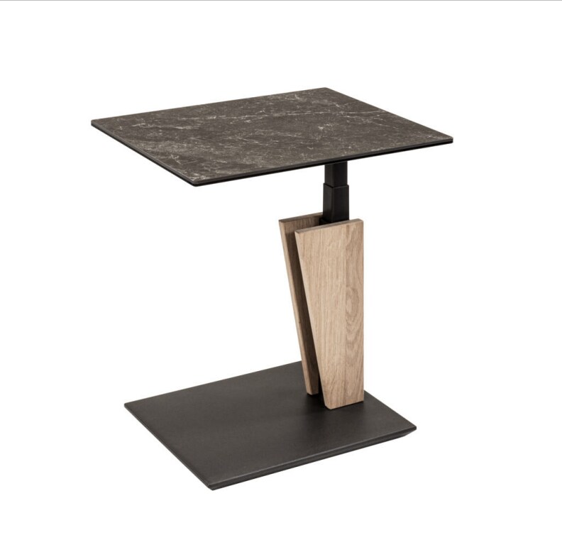 Vierhaus Beistelltisch Platte Keramik auf Glas, stufenlos höhenverstellbar, Wangen Wildeiche massiv, rollbar