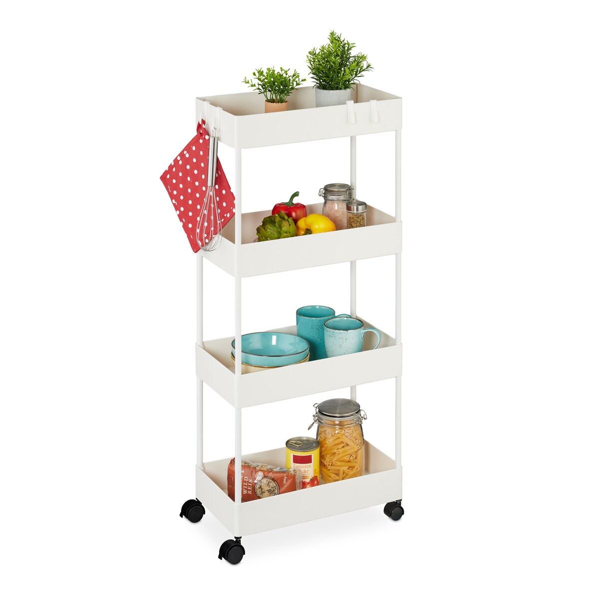 Relaxdays Rollwagen, 4 Ebenen, H x B x T: 93 x 40 x 22 cm, 4 Rollen, Badezimmer, Küche, schmaler Beistellwagen, weiß